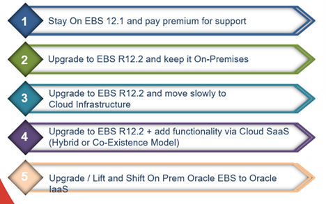 Has your organization taken on a firm cloud-first mindset? An EBS upgrade may still be an option. EBS customers on 12.1 or lower versions have the following options: