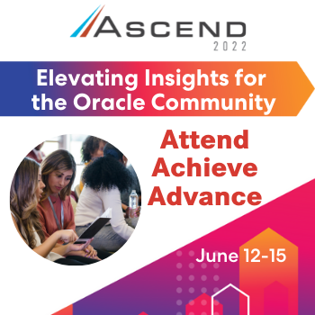 Ascend is the Oracle user community event that unites functional users, IT professionals and expert resources for frank discussion and practical education to elevate insights and improve decision making, project planning and business operations. Make plans now reconnect with the Oracle community June 12-15, 2022 in Las Vegas or virtually.